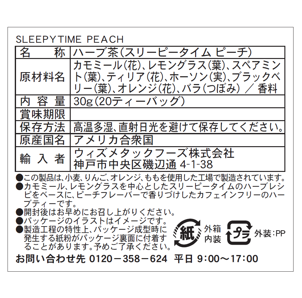 カモミール、レモングラスを中心としたスリーピータイムのハーブレシピをベースに、ピーチフレーバーで香りづけしたハーブティーです。