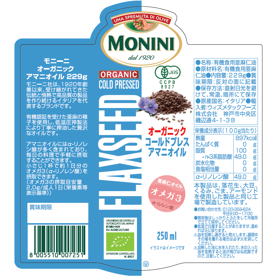 有機栽培の亜麻の種子からコールドプレス(低温圧搾)された有機JAS認証のオーガニックアマニオイルです。体内で作ることができない必須脂肪酸(αーリノレン酸)が含まれています。サラダや納豆、おひたしなどの料理の仕上げにひとかけしてお召し上がりください。熱に弱い性質のため、加熱料理には使用せず、そのままお使いください。